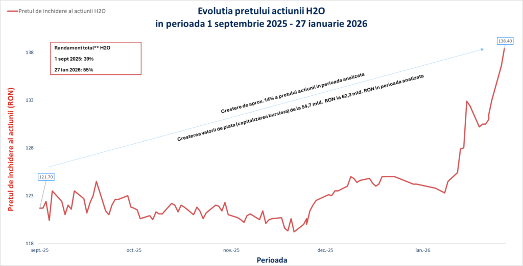 Astfel, în intervalul menționat (1 septembrie 2025 – 27 ianuarie 2026), capitalizarea bursieră a companiei a crescut cu aproximativ 14%, de la 54,7 miliarde lei la 62,3 miliarde lei, poziționând Hidroelectrica ca a doua cea mai mare companie românească din punct de vedere al capitalizării bursiere.