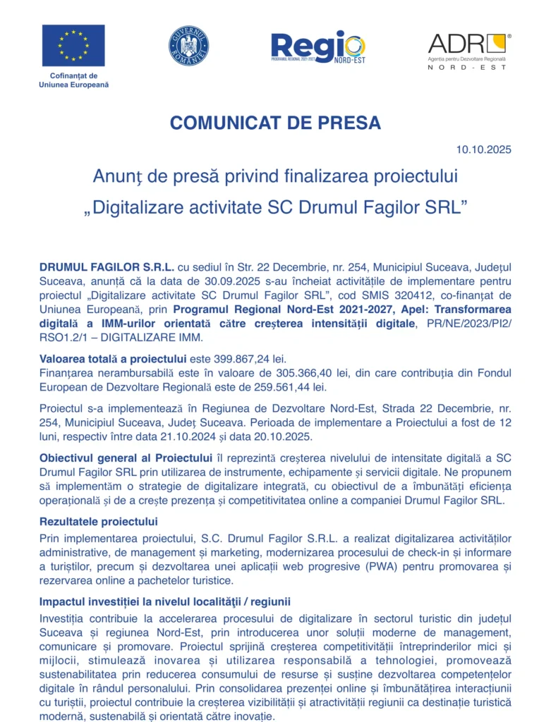 Fonduri Europene Anunţ de presă privind finalizarea proiectului „Digitalizare activitate SC Drumul Fagilor SRL” Autor Contributor Publicat 10 octombrie 2025 Distribuie Distribuie articolul Facebook Whatsapp Whatsapp LinkedIn Reddit Telegram Email Copy Link Print Distribuie Articolul anterior Dialoguri culturale – Interviu cu Al. Florin Țene, Președintele Ligii Scriitorilor Români Articolul următor Grădinița privată în Voluntari – un mediu sigur pentru dezvoltarea armonioasă a copiilor Niciun comentariu Lasă un răspuns Anulează răspunsulAdresa ta de email nu va fi publicată. Câmpurile obligatorii sunt marcate cu *Comentariu * Nume * Email * Site web -Publicitate- Ultimele articole Papa Leon, apel la solidaritate cu săracii și străinii în mesajul de Crăciun Extern Mesajul preşedintelui Nicușor Dan de Crăciun. „Sunt cele mai prețioase daruri” Actualitate Bombardiere rusești în nordul Scandinaviei. Moscova spune că a fost un zbor „planificat” Extern Știri FinanciareCe program au magazinele din marile rețele de retail de Crăciun și Anul NouBrandul de produse premium de travel Harper Collective este disponibil și în RomâniaMcDonald’s a deschis la Mediaș după o investiție de aproape 9 milioane leiVrei să vezi cum se produce mobila românească? LEMET deschide porțile fabricii