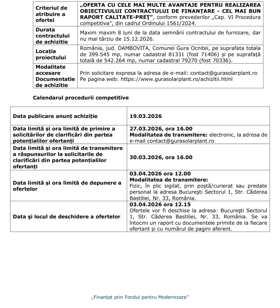 Fonduri Europene ANUNȚ Privind lansarea procedurii competitive de achiziție „Realizare centrală fotovoltaică o putere instalata de 48,90 MW – FULL EPC” Autor Contributor Publicat 19 martie 2026 Distribuie Distribuie articolul Facebook Whatsapp Whatsapp LinkedIn Reddit Telegram Email Copy Link Print Distribuie Articolul anterior Răzvan Burleanu rămâne președintele FRF! A câștigat alegerile cu un scor incredibil Articolul următor ANUNŢ PRIVIND SELECȚIA A 2 (DOI) MEMBRI AI DIRECTORATULUI Niciun comentariu Lasă un răspuns Anulează răspunsulAdresa ta de email nu va fi publicată. Câmpurile obligatorii sunt marcate cu *Comentariu * Nume * Email * Site web -Publicitate- Ultimele articole Scădere notabilă a volumului de construcții Construcții Din nou, scumpire masivă a carburanților azi, prețul a sărit de 10 lei litrul în unele stații Energie Preşedintele Nicușor Dan s-a întâlnit la Bruxelles cu secretarul general al NATO, Mark Rutte Politic Știri FinanciareRevitalizarea spațiilor industriale: cum sunt transformate clădirile istorice în hale și depozite moderne pentru afaceriCererea pentru case pe structură metalică a crescut de aproape 10 oriRețeaua socială românească eYou intră în faza de pre-lansare după o investiție de 300.000 euroAllview Auto lansează o mașină electrică cu 5 uși care poate fi condusă de la 16 ani