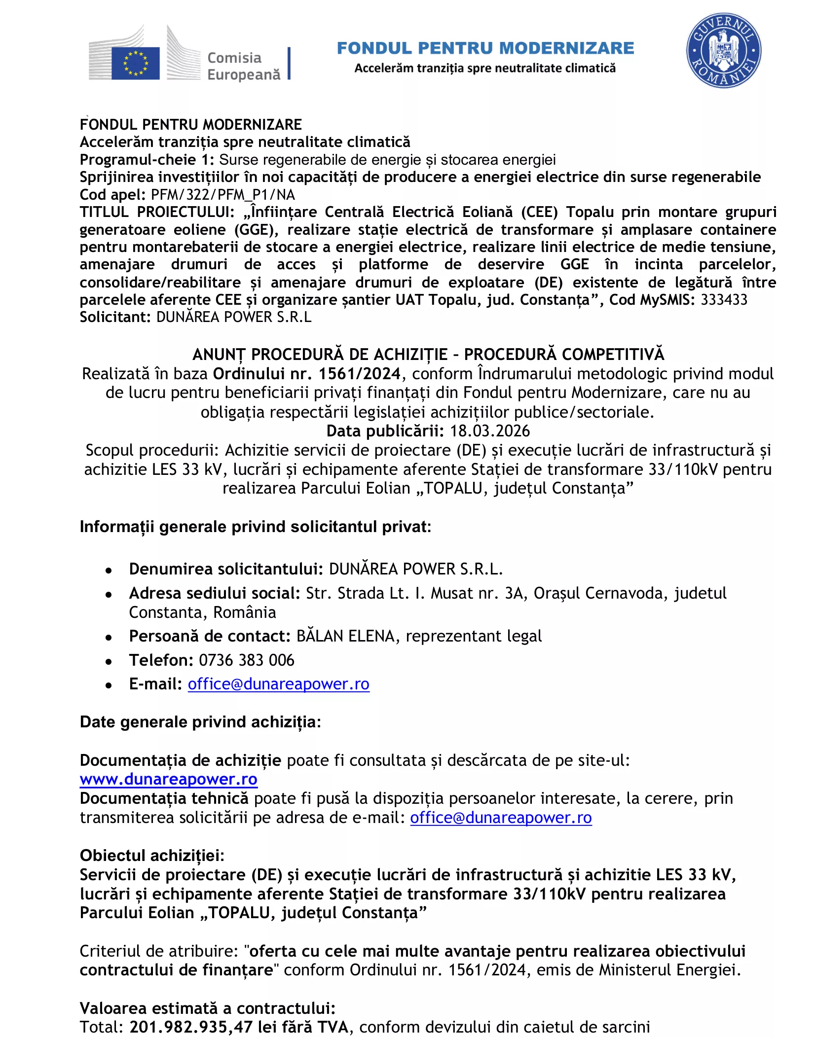 Fonduri Europene ANUNȚ PROCEDURĂ DE ACHIZIȚIE – PROCEDURĂ COMPETITIVĂ Autor Contributor Publicat 18 martie 2026 Distribuie Distribuie articolul Facebook Whatsapp Whatsapp LinkedIn Reddit Telegram Email Copy Link Print Distribuie Articolul anterior ANUNȚ PRIVIND SELECȚIA CANDIDAȚILOR PENTRU POSTURILE DE DIRECTOR GENERAL, DIRECTOR ECONOMIC SI DIRECTOR TEHNIC Articolul următor Secretele construcțiilor rezistente: betonul Niciun comentariu Lasă un răspuns Anulează răspunsulAdresa ta de email nu va fi publicată. Câmpurile obligatorii sunt marcate cu *Comentariu * Nume * Email * Site web -Publicitate- Ultimele articole Sărbători pascale luminate! Actualitate Evenimente din lumea artelor vizuale recomandate de UAP Cultură și Educație Grevă la Lufthansa. Traficul aerian dintre România și Germania este serios afectat Extern Știri FinanciareAnimaWings inaugurează primele zboruri directe către Atena, de la Timișoara și Cluj-NapocaPrima istorie documentată a real estate-ului român modern se lansează pe 21 apriliePeste 65% dintre mașinile noi înmatriculate în martie au fost electrice sau hibridNolte Home Studio, afaceri de aproximativ 6,6 milioane lei în 2025