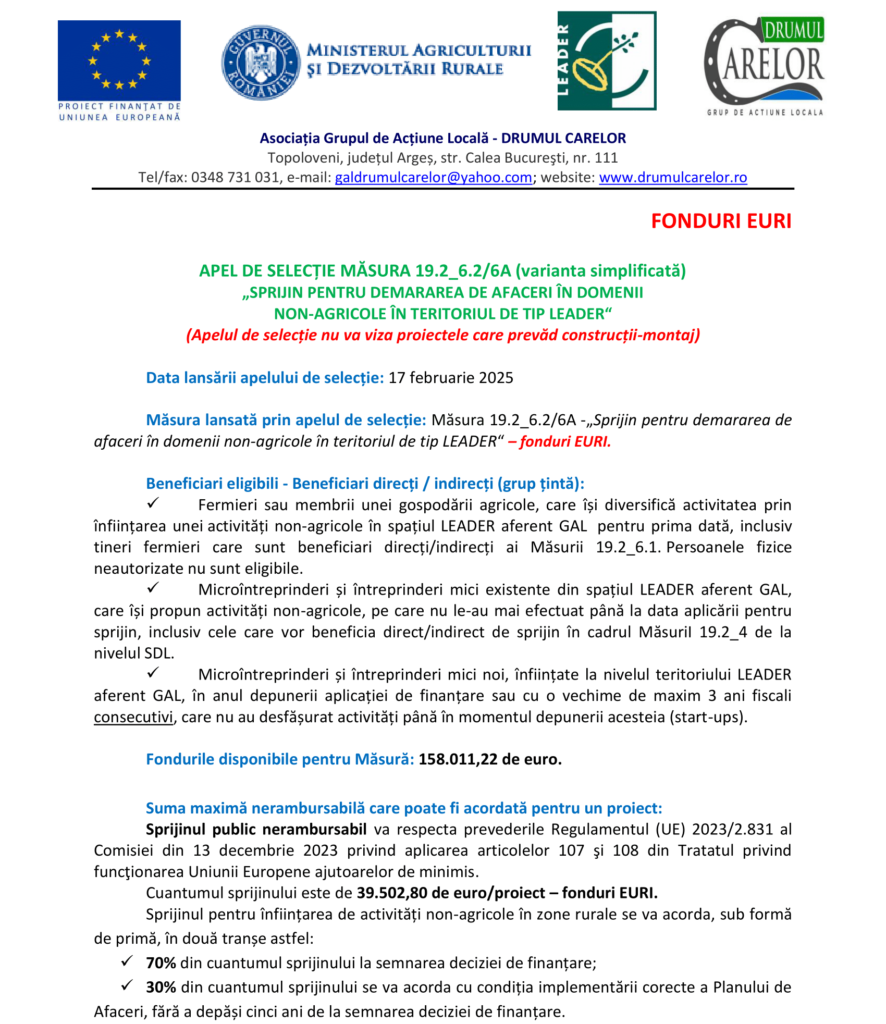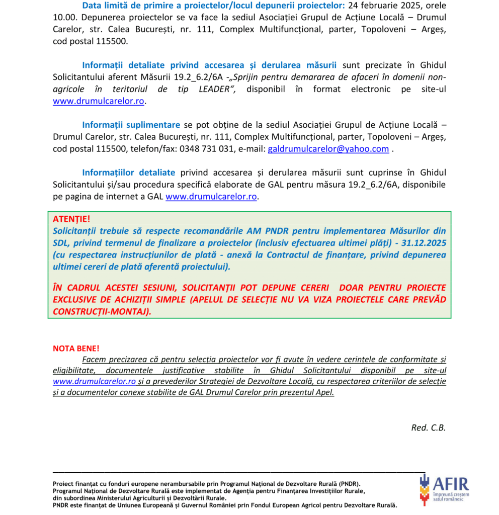 Fonduri Europene APEL DE SELECȚIE MĂSURA 19.2_6.2/6A Autor Contributor Publicat 13 februarie 2025 Distribuie Distribuie articolul Facebook Whatsapp Whatsapp LinkedIn Reddit Telegram Email Copy Link Print Distribuie Articolul anterior Tradiții de Yuanxiao: Cum se sărbătorește Festivalul Lampioanelor în diferite regiuni ale Chinei Articolul următor Construire imobil – Centrul Școlar pentru Educație Incluzivă „Dumitru Ciumăgeanu” Niciun comentariu Lasă un răspuns Anulează răspunsulAdresa ta de email nu va fi publicată. Câmpurile obligatorii sunt marcate cu *Comentariu * Nume * Email * Site web -Publicitate- Ultimele articole Jean Georgesco – un român şi filmul european Cultură și Educație JO Hochei: Statele Unite cuceresc aurul olimpic după o finală în care s-au autodepășit Sport Consiliul Concurenței pune în dezbatere angajamentele propuse de Sameday pentru a putea prelua Cargus Companii Știri FinanciarePrețurile locuințelor noi din București au crescut cu procente între 50 și 100% în cinci aniHambar Gardens, un nou proiect de case cu 100% energie verde, dotate cu pompă de caldură geotermicăBrokerii Victoria Finance au intermediat în 2025 credite în valoare de 24 milioane de euroPinum va inaugura anul acesta noua fabrică de la Moara Vlăsiei