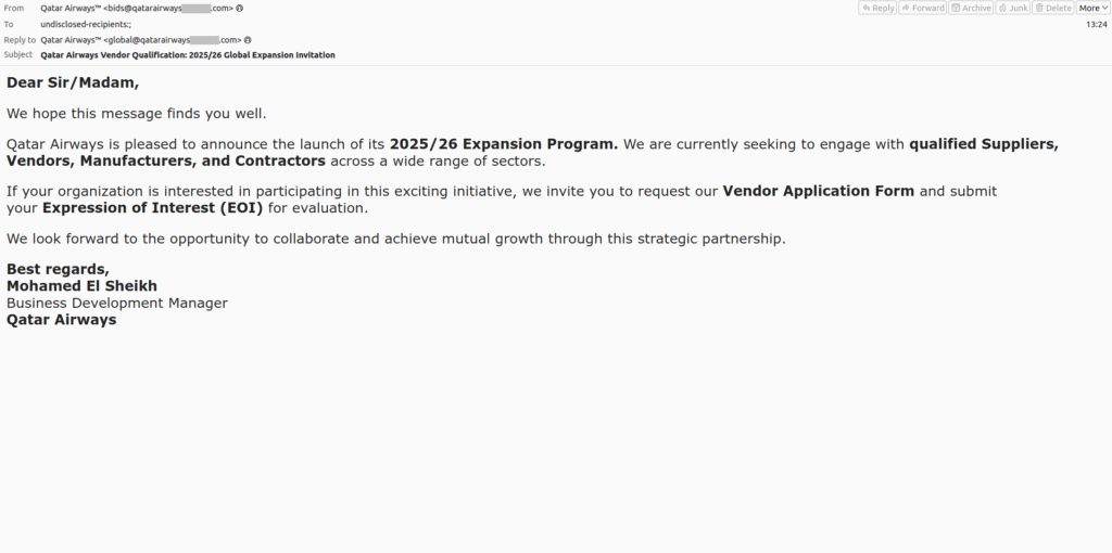 Aceste mesaje pretind, de obicei, că provin de la departamentele de achiziții ale unor companii aeriene importante, anunțând noi proiecte și căutând furnizori sau contractori. După ce destinatarul răspunde, atacatorii trimit o serie de documente false, precum formulare de înregistrare a furnizorilor sau acorduri de confidențialitate, pentru a părea credibili. Organizațiile vizate sunt apoi rugate să plătească un „Depozit rambursabil obligatoriu de exprimare a interesului”, în valoare de câteva mii de dolari, pretins necesar „pentru a asigura o poziție prioritară în calendarul parteneriatului”, cu promisiunea că suma va fi rambursată după semnarea „parteneriatului”.