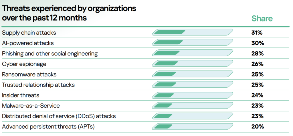 Conform sondajului comandat de Kaspersky, 31% dintre companiile mari au fost afectate de un atac asupra lanțului de aprovizionare în ultimele 12 luni, mai mult decât de orice alt tip de amenințare cibernetică. Amenințarea este concentrată în special asupra organizațiilor cel mai puternic conectate, marile companii raportând cea mai ridicată rată a atacurilor experimentate – 36% – comparativ cu organizațiile din categoria low și mid-size enterprise.