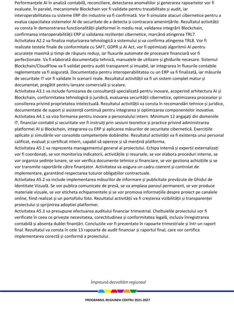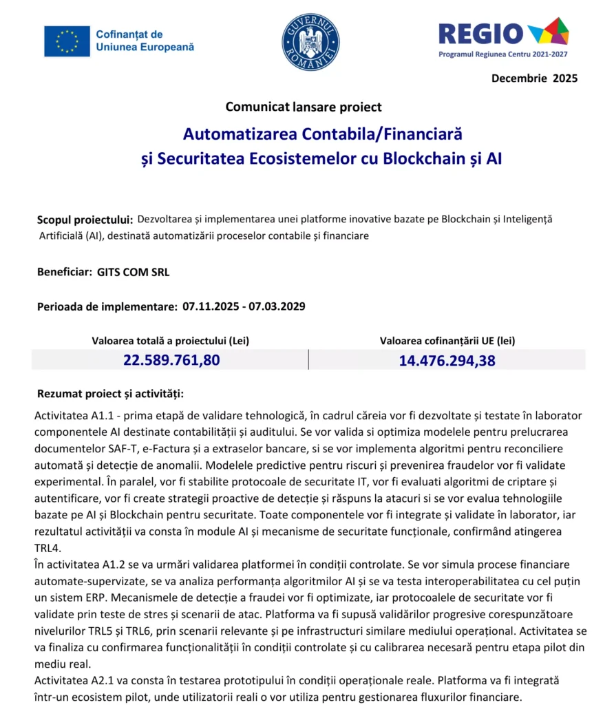 Fonduri Europene Automatizarea Contabila/Financiară și Securitatea Ecosistemelor cu Blockchain și AI Autor Contributor Publicat 3 decembrie 2025 Distribuie Distribuie articolul Facebook Whatsapp Whatsapp LinkedIn Reddit Telegram Email Copy Link Print Distribuie Articolul anterior Grup de lucru CMG 4K/8K pentru JO de Iarnă 2026 Articolul următor Finalizare proiect Achiziție mijloace de transport publice – autobuze electrice 10m Lugoj Niciun comentariu Lasă un răspuns Anulează răspunsulAdresa ta de email nu va fi publicată. Câmpurile obligatorii sunt marcate cu *Comentariu * Nume * Email * Site web -Publicitate- Ultimele articole Consiliul Concurenţei analizează preluarea mai multor companii de către Sika AG Companii ANL a recepţionat 24 de locuinţe pentru tineri în orașul Boldești-Scăeni Actualitate A fost scăzută valoarea minimă a obligațiilor fiscale restante pentru debitorii persoane fizice de la 3.000 la 1.200 de lei Fiscalitate Știri FinanciareEconomia dietelor specifice: Cum s-a transformat nișa produselor „fără” într-o piață globală de miliardeManagementul activelor imobiliare: Cum protejezi valoarea unei proprietăți prin controlul microclimatuluiValoarea medie a pensiei se apropie de 2.800 lei, în RomâniaSistemul de preluare a ambalajelor reciclabile cu sacul, IZI, bifează returnarea cu numărul 1 milion