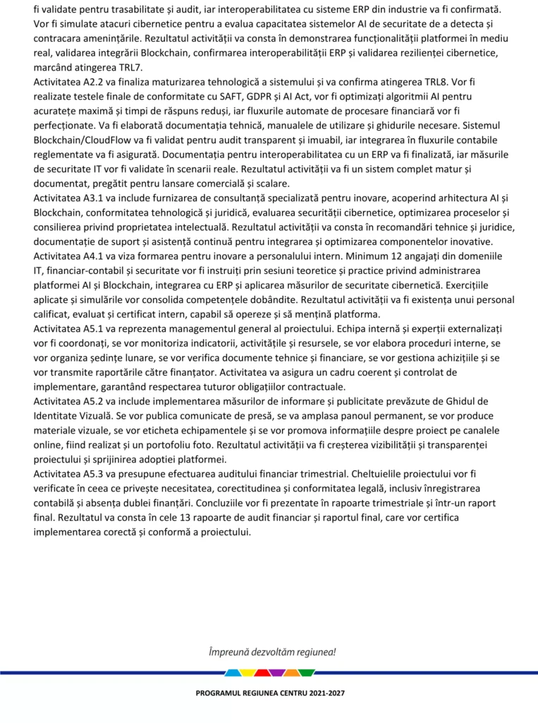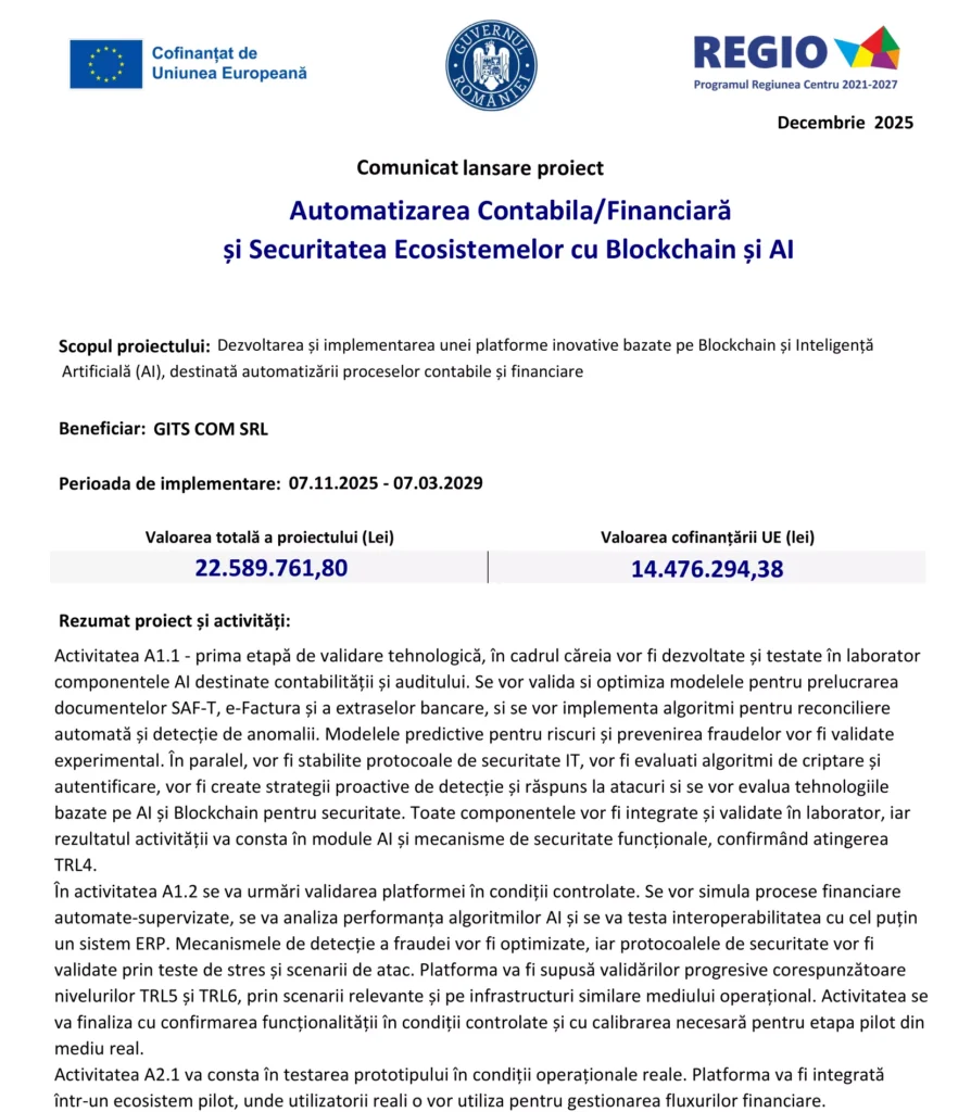 Fonduri Europene Automatizarea Contabila/Financiară și Securitatea Ecosistemelor cu Blockchain și AI Autor Contributor Publicat 3 decembrie 2025 Distribuie Distribuie articolul Facebook Whatsapp Whatsapp LinkedIn Reddit Telegram Email Copy Link Print Distribuie Articolul anterior Grup de lucru CMG 4K/8K pentru JO de Iarnă 2026 Articolul următor Finalizare proiect Achiziție mijloace de transport publice – autobuze electrice 10m Lugoj Niciun comentariu Lasă un răspuns Anulează răspunsulAdresa ta de email nu va fi publicată. Câmpurile obligatorii sunt marcate cu *Comentariu * Nume * Email * Site web -Publicitate- Ultimele articole Cupa Spengler: Favoritele se impun, dar Team Canada o face cu emoții în fața debutanților de la U.S. Collegiate Selects Sport Ordonanța trenuleț 2026 stabilește o singură limită pentru microîntreprinderi: 100.000 euro Economie Featured Opinii Cum supraviețuiește o piață de cărți veche de 475 de ani în centrul Parisului într-o lume digitală Cultură și Educație Știri FinanciareCe program au magazinele din marile rețele de retail de Crăciun și Anul NouBrandul de produse premium de travel Harper Collective este disponibil și în RomâniaMcDonald’s a deschis la Mediaș după o investiție de aproape 9 milioane leiVrei să vezi cum se produce mobila românească? LEMET deschide porțile fabricii