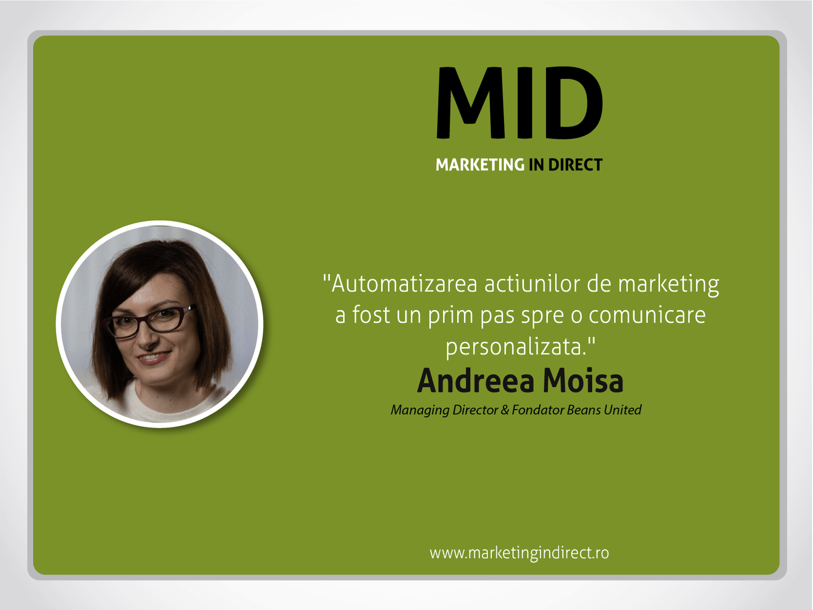 Andreea Moisa, Managing Director & Fondator Beans United – Speaker la cea de-a 10a ediţie a Conferinţei „Marketing în Direct”: „Automatizarea acțiunilor de marketing a fost un prim pas spre o comunicare personalizată. Pe măsură ce se dezvoltă capacitatea de a interpreta și a învăţa din datele colectate, marketerii vor putea să treacă de la presupuneri și ipoteze la campanii inteligente.”