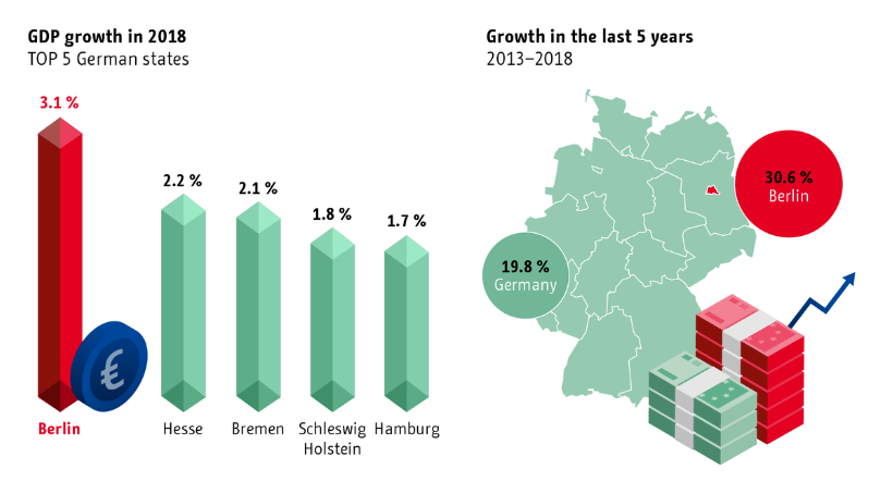 La 30 de ani de la căderea Zidului, Berlinul a devenit motorul dezvoltării economice a Germaniei. De ani de zile, capitala Germaniei a fost lider în statisticile de creștere economică, iar în ultimii cinci ani, PIB-ul Berlinului a crescut cu peste 30%.