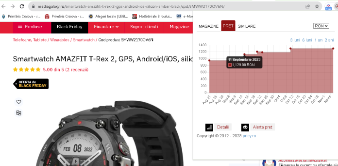 Un exemplu de produs al cărui preţ mediu a crescut considerabil înainte de Black Friday este un Smartwatch AMAZFIT T-Rex 2. Acesta are un preţ promoţional de Black Friday de 987,25 lei, scăzut de la 1187,25 la Media Galayy, care a demarat perioada ofertelor. Însă pe 20 august acesta avea un preţ mediu de 947 lei, conform pricy.ro, un plugin care compară preţurile produselor şi arată evoluţia preţurilor într-o perioadă mai lungă de timp. În septembrie, costul acestuia a crescut la 1129 lei, iar în octombrie la 1299 lei. Astfel, în numai 3 luni, produsul a cunoscut mai multe scumpiri, ajungând la un vârf în perioada 20 octombrie – 6 noiembrie, fix cu câteva săptămâni înainte de Black Friday. În urmă cu 16 zile, acest produs avea preţul de 899.99 lei pe eMag, arată pricy.ro. În prezent, pe eMag, acesta costă 1149,98 lei.