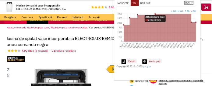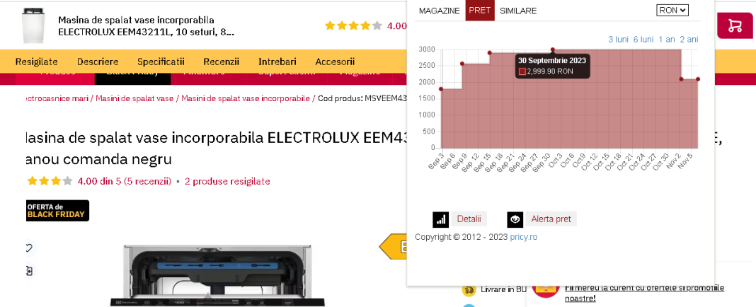 În mod similar, o maşină de spălat vase incorporabilă care avea un preţ mediu de 1798,93 lei pe 2 septembrie costă, în oferta de BF Altex 2099 lei. Preţul acesteia ajunsese pe 7 septembrie la 2569 lei, iar pe 14 septembrie la 2899 lei. Pe 30 septembrie, preţul sau a mai crescut cu 100 lei, ajungând la 2999 lei, preţul de referinţă menţionat de Altex în oferta de Black Friday.
