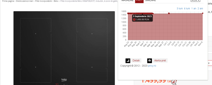 Un exemplu care indică aceeaşi strategie de mărire a preţurilor cu aproximativ o lună înainte de BF 2023 este o plită incorporabilă Beko din oferta Evomag, care costă 1499,99 lei, cu 799,91 lei mai puţin decât preţul recomandat de producător afişat pe site-ul magazinului, de 2299,90 lei. Preţul mediu al acesteia este, însă, neschimbat în ultimele 6 luni. Tot 1499,99 lei.