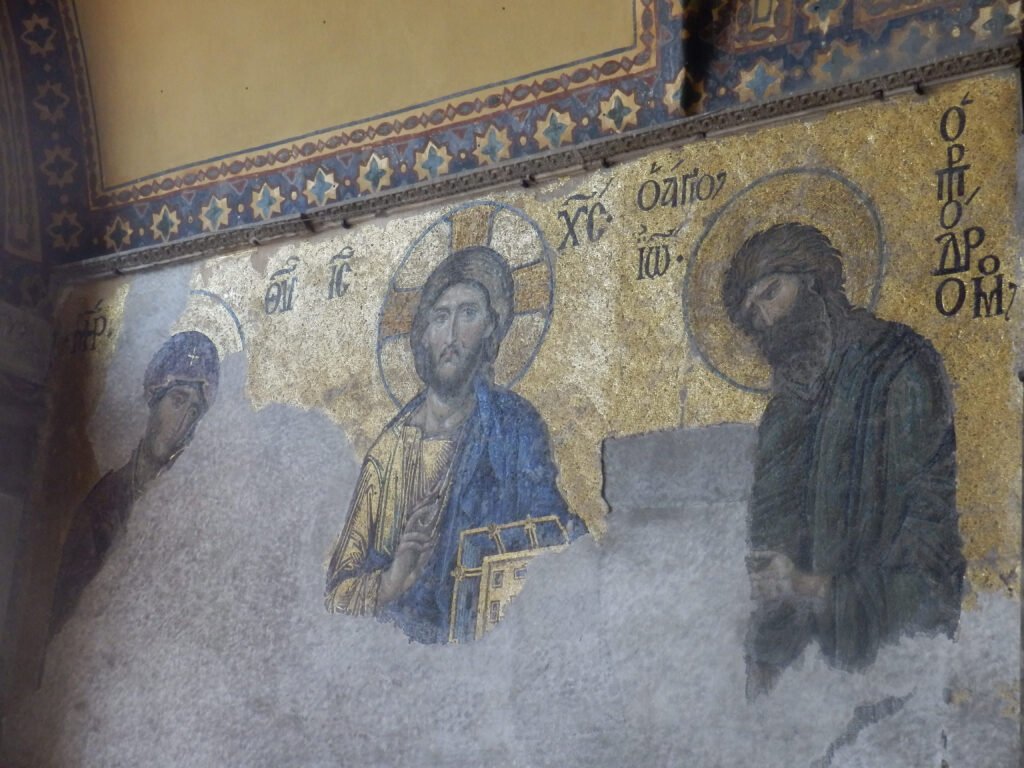 Mozaicurile – din fericire păstrate până în zilele noastre (în perioada dominaţiei otomane, acestea au fost acoperite cu un strat subţire de tencuială) – încântă privirile numeroşilor vizitatori care stăruie în faţa lor minute în şir: Mozaicul Porţii Imperiale, datând din secolul al IX-lea, Îl înfăţişează pe Iisus aşezat pe un tron imperial, care ne binecuvântează, ţinând în mâna stângă un text unde sunt scrise următoarele cuvinte: “Pace vouă, eu sunt lumina lumii.”; Împăratul Leon al VI-lea se închină Mântuitorului, iar în medalioanele laterale sunt portretele Fecioarei Maria şi Arhanghelului Gabriel; Fecioara cu Pruncul în braţele Sale, aflată în semicupola Absidei Altarului, este încadrată de cei doi Arhangheli (din care doar Gabriel înfăţişat într-un mozaic înalt de 5 metri se mai păstrează);Deesis: în dreapta Mântuitorului, stă cu smerenie Sfântul Ioan Botezătorul, iar în stânga Sa, se află Fecioara Maria (din păcate, mozaicul este parţial distrus, îndeosebi în partea inferioară); Iisus Hristos,în mijloc, împreună cu Împărăteasa Zoe şi Împăratul Constantin Monomachos (se povesteşte că Zoe a fost măritată de 3 ori şi, de fiecare dată, mozaicul era schimbat cu figura şi numele noului soţ); Fecioara Maria cu Iisus în braţele Sale, încadrată de Împăratul IoanComnenus şi Împărăteasa Irina;Fecioara Maria cu Pruncul, aşezată pe un tron de argint şi flancată la dreapta de Constantin cel Mare care îi oferă macheta oraşului Constantinopol şi la stânga de Iustinian I care îi oferă macheta Bisericii “Hagia Sofia”; Iisus Pantocrator din centrul cupolei(mozaic ce fusese înlocuit temporar de către turci cu un verset din Coran).