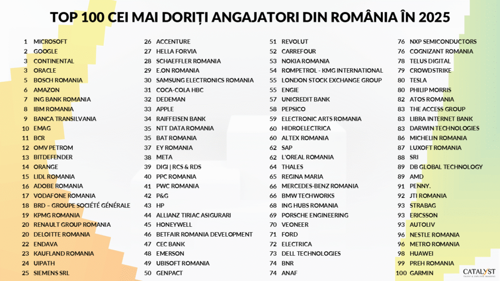 Pentru al 20 an consecutiv, studiul Cei mai doriți angajatori a fost realizat la nivel național, pe baza a 12 161 de răspunsuri libere, neasistate ale respondenților. Top 100 Cei mai doriți angajatori este un clasament realizat în baza răspunsurilor libere și neasistate la întrebarea: “Care este topul primilor 5 angajatori pentru care îți dorești să lucrezi?“ Numărul ridicat de nominalizări pentru titlul de cel mai dorit angajator poate fi influențat de factori precum dimensiunea organizației, prezența geografică extinsă sau varietatea rolurilor disponibile în cadrul companiei.