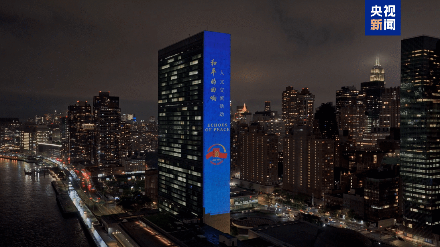 Seara, cu ajutorul tehnologiei de proiecție laser de înaltă definiție, CMG a transformat fațada clădirii ONU într-un ecran uriaș pentru un scurtmetraj dedicat celei de-a 80-a aniversări a victoriei în Războiul de Rezistență al Poporului Chinez împotriva Agresiunii Japoneze și în Războiul Mondial Antifascist.