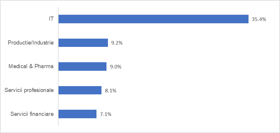 Cu o contribuție de aproape 7% din PIB, sectorul IT a generat peste 35% din cererea nouă de birouri, tranzacționând în această perioadă 375.730 mp la nivel național – de departe cel mai dinamic domeniu.