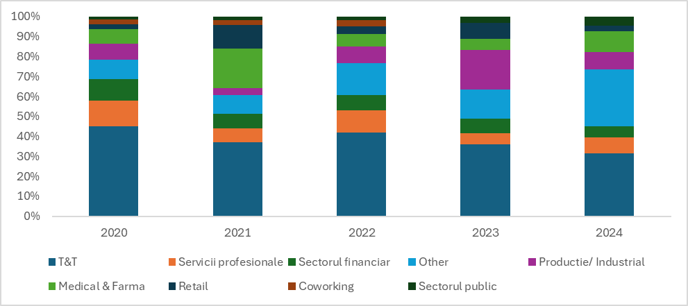 Cererea de spații de birouri în funcție de domeniul de activitate 2020-2024