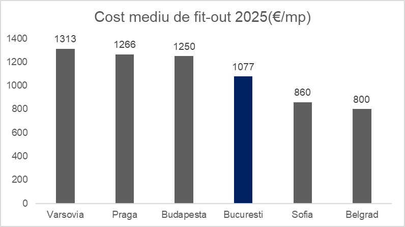 Un proiect de fit-out complet (incluzând lucrări pentru absolut toate specialitățile, IT, BMS, mobilier, echipamente audio-video, servicii profesionale și cheltuieli neprevăzute) se bugetează, în medie, la 1.077 euro/mp în București, ceea ce menține Capitala printre cele mai atractive opțiuni din regiune pentru companiile care deschid, consolidează sau relochează birouri.
