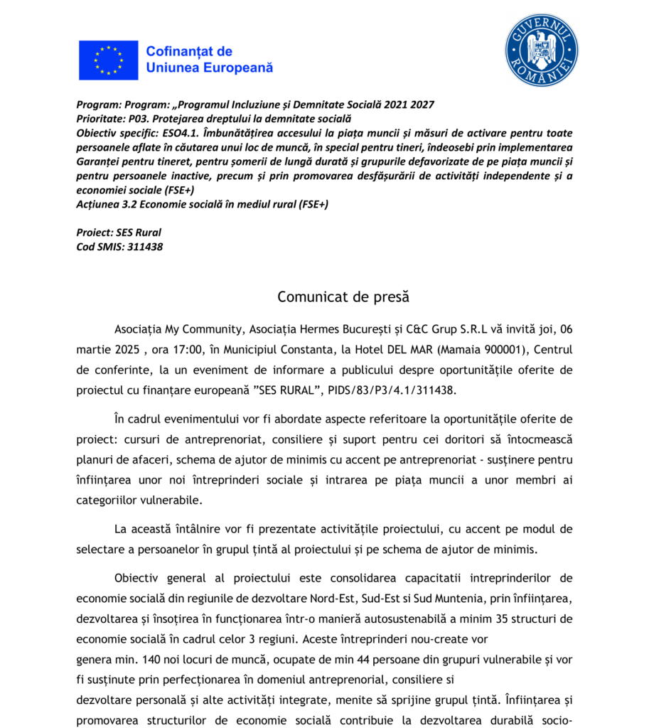 Fonduri Europene Comunicat de presă Autor Contributor Publicat 27 februarie 2025 Distribuie Distribuie articolul Facebook Whatsapp Whatsapp LinkedIn Reddit Telegram Email Copy Link Print Distribuie Articolul anterior Ce operațiuni complexe poți eficientiza cu aplicațiile de HR și payroll? Articolul următor La cenaclul literar ”Artur Silvestri”, Medalionul literar ”Dragobetele – simbolul iubirii dintre români” Niciun comentariu Lasă un răspuns Anulează răspunsulAdresa ta de email nu va fi publicată. Câmpurile obligatorii sunt marcate cu *Comentariu * Nume * Email * Site web -Publicitate- Ultimele articole Anul Nou Chinezesc a început sub semnul Calului de Foc Actualitate Informații oficiale din partea Ambasadei R. P. Chineze Obligația de acceptare a plăților moderne introdusă din 1 ianuarie 2026: Impactul asupra mediului de afaceri în România Actualitate ANSVSA inițiază un dialog național pentru elaborarea unei strategii integrate și coerente privind gestionarea câinilor fără stăpân Actualitate Știri FinanciareUber Eats revine pe piața din România. Compania a oprit activitățile locale în 2020CTPark Bucharest South, extins cu o nouă clădire de 54.000 metri pătrațiGrupul Ascendis a încheiat 2025 cu venituri de 13,3 milioane de euroBăneasa Tumor Center, primul spital dedicat exclusiv tratamentului patologiilor tumorale