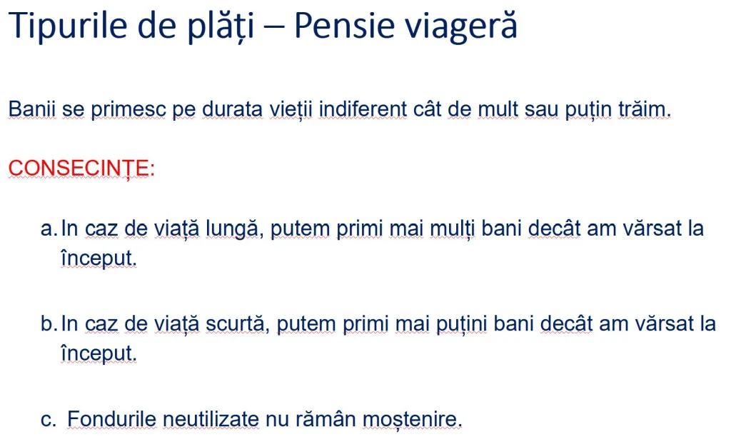 „Pensia viageră garantează o plată pe întreaga durată a vieții, și oricât de mult trăiți, și oricât de puțin trăiți. Riscul de longevitate îl ia plătitorul. Dacă trăiți mai mult, puteți lua mai mulți bani decât ați contribuit. Pensia nu mai este limitată de suma contribuită. Dar dacă persoanele trăiesc mai puțin, suma primită va fi mai mică decât cea acumulată, iar suma rămasă nu se moștenește”, a explicat Radu Crăciun.