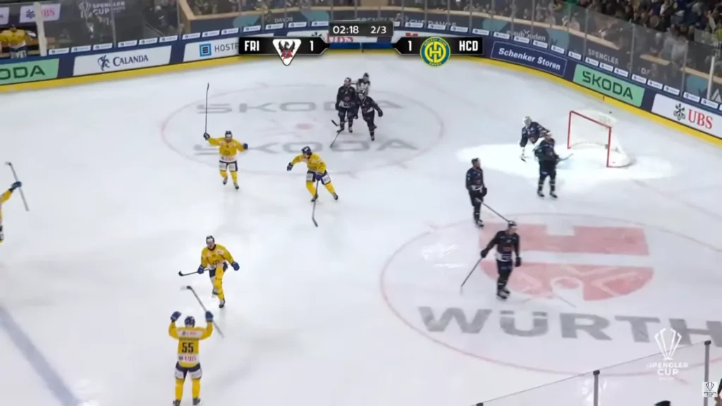 Inepuizabilul Sorensen își va trece din nou numele pe lista marcatorilor, egalând pentru Fribourg, dar a avut mare noroc, fiindcă pucul șutat de el a fost deviat decisiv (și total imprevizibil) de un apărător de la Davos.