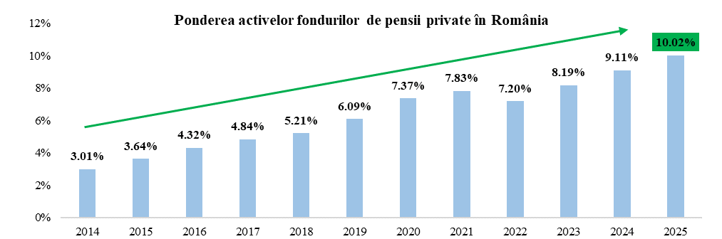 Dimensiunea sistemului de pensii private a crescut semnificativ în cei 17 ani de existență, ajungând să dețină peste 10% din PIB. Valoarea activelor fondurilor de pensii private a realizat un salt semnificativ, confirmând impactul important al acestui sector în dezvoltarea economică a României. Într-un context economic volatil la nivel global, sectorul pensiilor private din România a dovedit o reziliență considerabila, păstrând un ritm constant de creștere. Astfel, ponderea activelor fondurilor în PIB a crescut de la 3,01% în 2014 la peste 10% în 2025, confirmând rolul stabilizator al acestui sector în contextul economic actual și importanța sa în echilibrul macroeconomic.