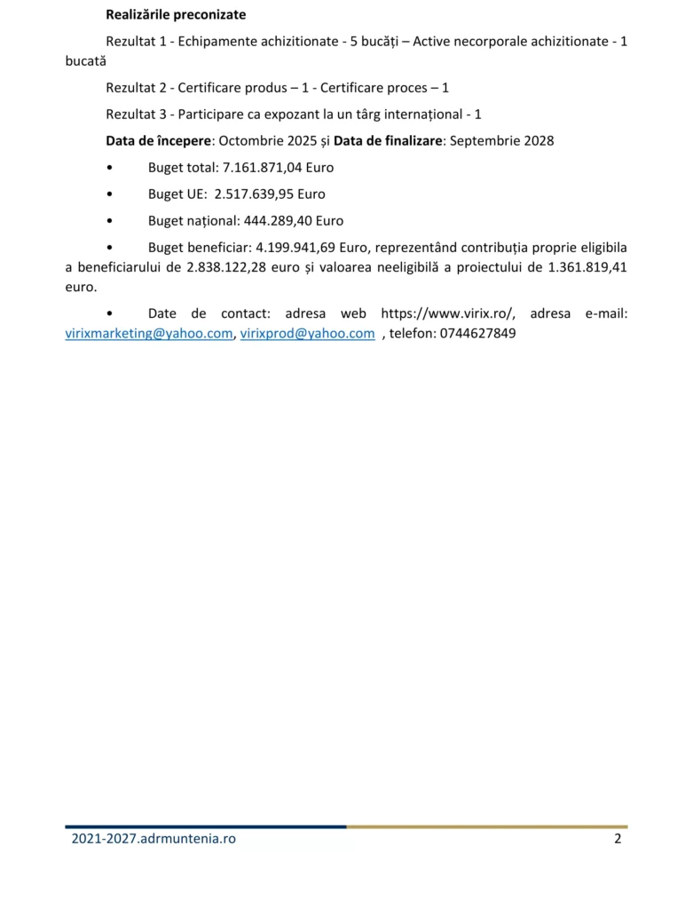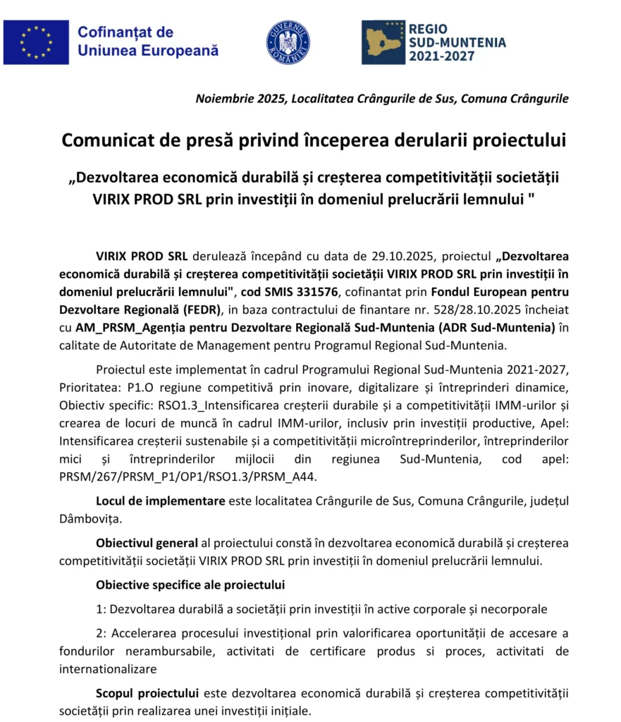 Reading: „Dezvoltarea economică durabilă și creșterea competitivității societății VIRIX PROD SRL prin investiții în domeniul prelucrării lemnului”