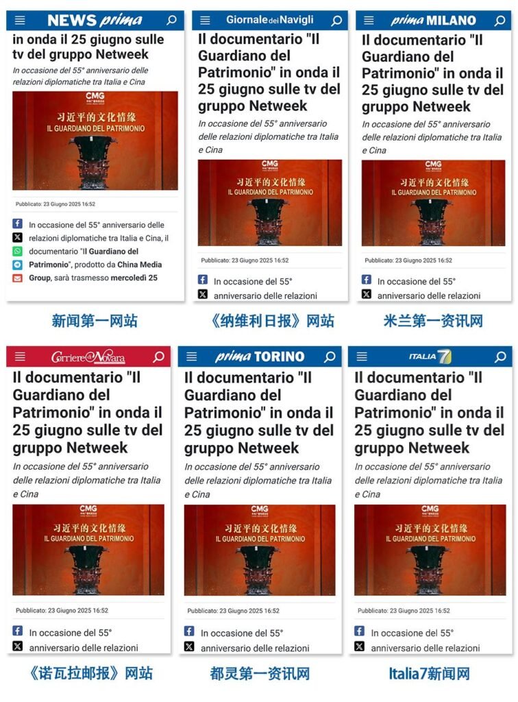 Cu ocazia celor 55 de ani de la stabilirea relaţiilor diplomatice China-Italia, documentarul „Gardianul patrimoniului”, realizat de China Media Group (CMG), va fi difuzat pe principalele platforme media italiene, inclusiv Alma TV, Lazio TV şi Milano Finanza, începând cu data de 25 iunie. Peste 40 de instituții media italiene, inclusiv News Prima, Giornale di Navigli și Prima Milano, au anunțat transmiterea programului, generând un mare interes în diferite cercuri sociale.