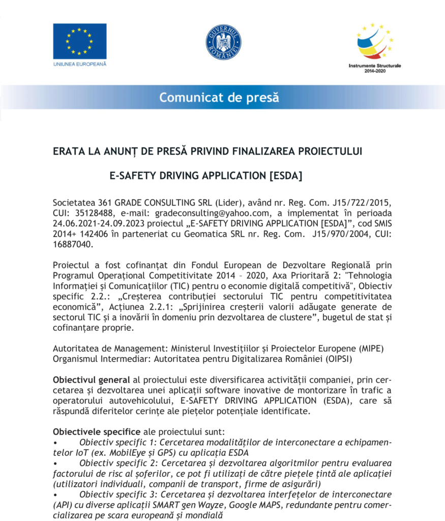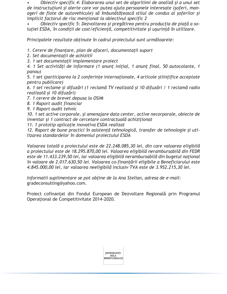 Fonduri Europene ERATA LA ANUNȚ DE PRESĂ PRIVIND FINALIZAREA PROIECTULUI E-SAFETY DRIVING APPLICATION [ESDA] Autor Contributor Publicat 5 februarie 2024 Distribuie Distribuie articolul Facebook Whatsapp Whatsapp LinkedIn Reddit Telegram Email Copy Link Print Distribuie Articolul anterior Omniasig a plătit un dosar de daună CASCO în 2023, în medie, în termen de 4 zile Articolul următor 70,3% din autoturismele nou înmatriculate sunt second hand Niciun comentariu Lasă un răspuns Anulează răspunsulAdresa ta de email nu va fi publicată. Câmpurile obligatorii sunt marcate cu *Comentariu * Nume * Email * Site web -Publicitate- Ultimele articole Premierul Ilie Bolojan anunţă adoptarea reformei administraţiei şi pachetul de relansare economică Economie Grevă națională în aeroporturile Italiei, pe 26 februarie: transportul aerian, afectat după Olimpiadă Actualitate Transporturi ARACO îl omagiază pe domnul Prof. Univ. Emerit DHC Dr. Ing. Ramiro Sofronie la împlinirea a 90 de ani Actualitate Știri FinanciareStartup-urile din România au atras 103 milioane euro în 2025„Refacerea ecosistemelor ripariene și de apă curgătoare degradate de pe cursul de apă lalomița, sector aval confluență Glod – amonte acumularea Pucioasa și afluentul lalomicioara aval confluență Valea Frumușelului”Primul restaurant Taco Bell din Republica Moldova se deschide la ChișinăuCompaniile se reorientează către evenimente de nișă, mai restrânse