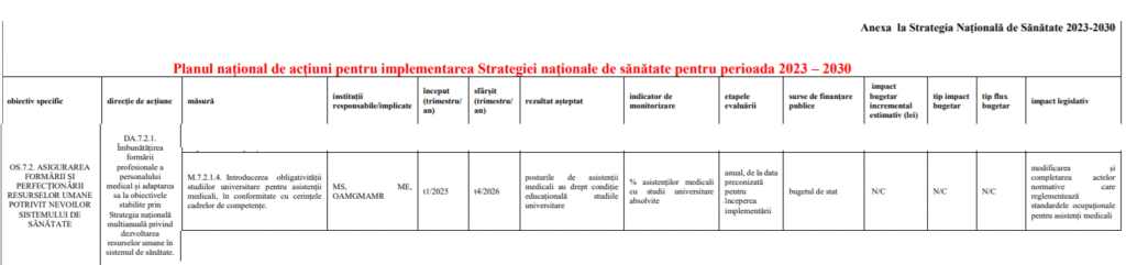 Conform prevederilor Planului național de acțiuni pentru implementarea Strategiei naționale de sănătate pentru perioada 2023-2030, Guvernul are în vedere introducerea obligativității studiilor superioare pentru asistentele medicale, până în anul 2030 (a se vedea Anexa nr. 1). Asta ar putea însemna că cele cca. 70.000 de asistente medicale absolvente de postliceală din sectorul public de sănătate riscă să-și piardă locurile de muncă dacă nu ajung la nivelul de studii superioare/nu urmează facultatea de asistente medicale.