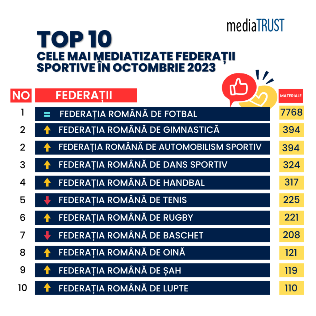 mediaTRUST prezintă vizibilitatea tuturor Federațiilor Sportive în mass-media, în perioada 1 – 31 octombrie 2023.