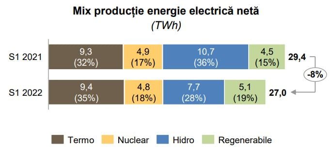 Producția de energie electrică a țării a scăzut cu 8% în primele șase luni ale anului 2022, potrivit datelor publicate recent de Transelectrica. Scăderea a fost generată în special de reducerea accentuată a producției hidro (minus 3 TWh), care nu a putut fi compensată de creșterea producției din regenerabile (plus 0,6 TWh). Datele aici: