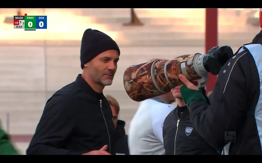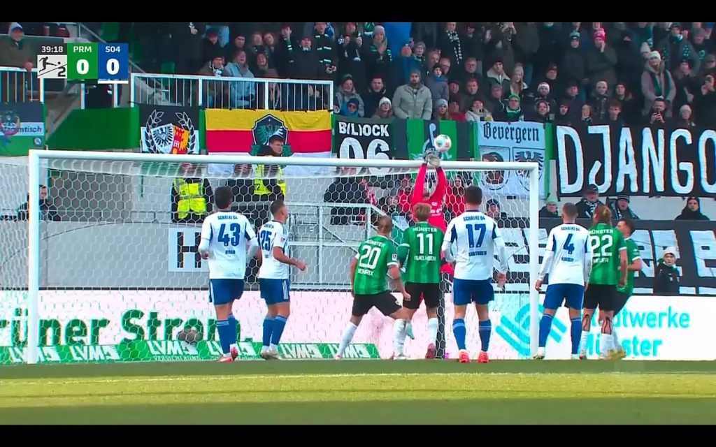 În repriza a doua, în minutul 55, s-a consumat o fază foarte importantă în economia jocului: un atacant de la Schalke scapă singur cu poarta adversă, Schenk, portarul celor de la Münster, îi iese în întâmpinare, mult în afara careului, cei doi se ciocnesc și rămân întinși pe gazon.