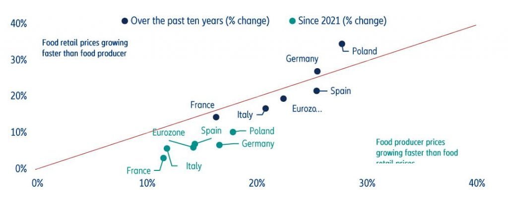 Analiștii Allianz Trade estimează că retailerii au transferat echivalentul a 75% din creșterile trecute ale prețurilor de producție asupra consumatorilor, calculând că inflația alimentelor ar costa consumatorul european 243 de euro în plus pentru același coș de produse alimentare comparativ cu 2021, cu estimări cuprinse între 200 și 250 de euro în cele mai mari patru piețe de consum din Europa. Venind peste o creștere generală a costului vieții (combustibil, electricitate, chirii, mâncare etc.), este probabil ca această creștere a prețurilor la alimente să readucă în discuție dezbateri cu privire la posibilele metode de asistență socială pentru a ușura povara celor mai vulnerabile gospodării.