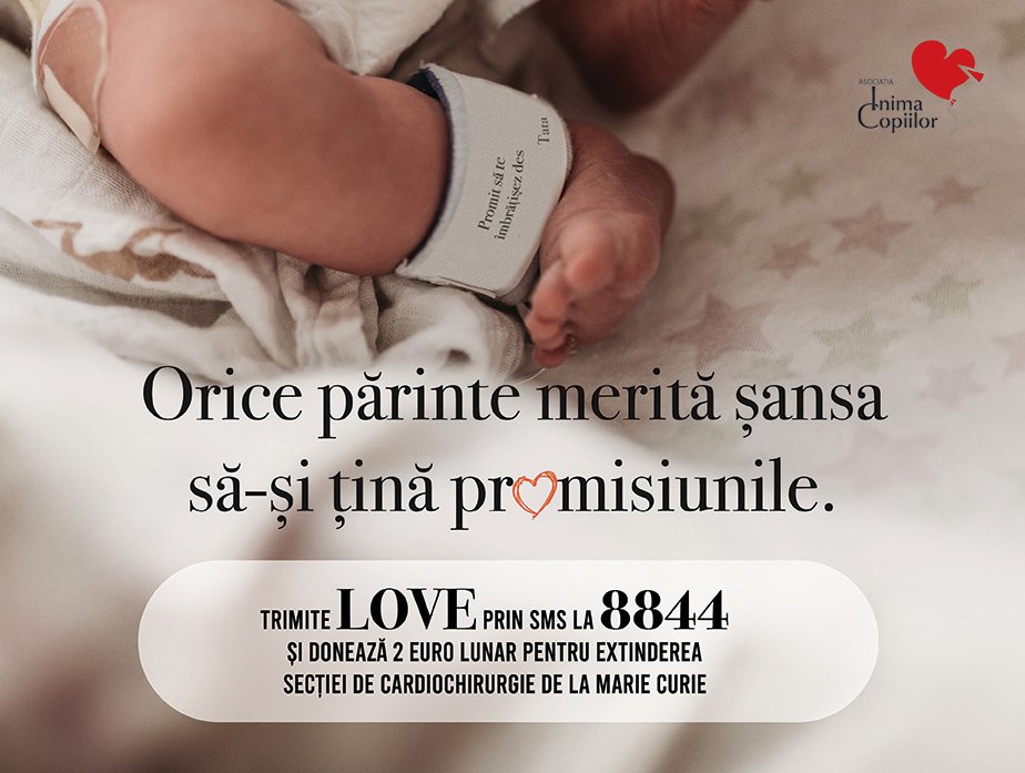 Inima Copiilor a demarat o campanie de strângere de fonduri pentru extinderea secției de Cardiochirurgie de la Spitalul Marie Curie din București, și încurajează publicul să adopte una dintre cele 10.000 de promisiuni pe care părinții le fac copiilor, printr-un gest simplu: un SMS la numărul 8844, cu textul “LOVE” urmat de numărul promisiunii alese de pe site – https://inimacopiilor.ro/promisiuni/, prin care fac o donație recurentă, lunară, de 2 euro, pentru strângerea fondurilor necesare, pentru că orice părinte merită șansa să-și țină promisiunile.