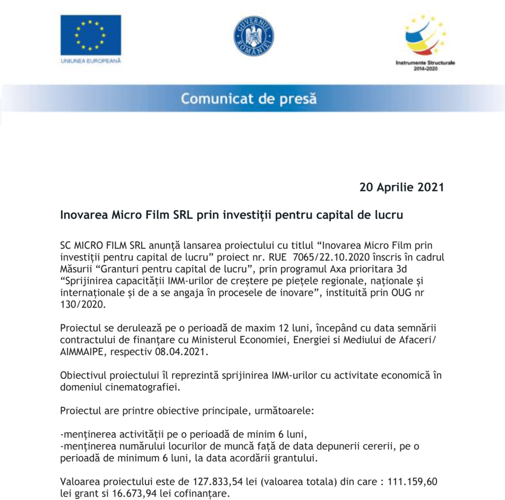 Fonduri Europene Inovarea Micro Film SRL prin investiții pentru capital de lucru Autor Curierul Național Publicat 21 aprilie 2021 Distribuie Distribuie articolul Facebook Whatsapp Whatsapp LinkedIn Reddit Telegram Email Copy Link Print Distribuie Articolul anterior Gala ANIS 2021 – Câștigătorii premiilor industriei IT Articolul următor MIPE propune autorităților locale o soluție flexibilă pentru proiectele de infrastructură de apă și apă uzată Niciun comentariu Lasă un răspuns Anulează răspunsulAdresa ta de email nu va fi publicată. Câmpurile obligatorii sunt marcate cu *Comentariu * Nume * Email * Site web -Publicitate- Ultimele articole Filme de festival sau independente versus mainstream Cultură și Educație Opinii Poezie şi apologie Cultură și Educație Federația Patronatelor din Turismul Românesc la ITB Berlin Turism Știri FinanciareCity Grill, afaceri de 90 milioane euro în 2025. Investiții în locații iconiceFabi Total Grup a închiriat 4.700 metri pătrați în CTPark Bucharest SouthSanconfind, afaceri în creștere cu aproape 11% pe parcursul anului 2025Rețeaua de magazine de proximitate Froo se extinde în Brașov, Craiova și Ploiești