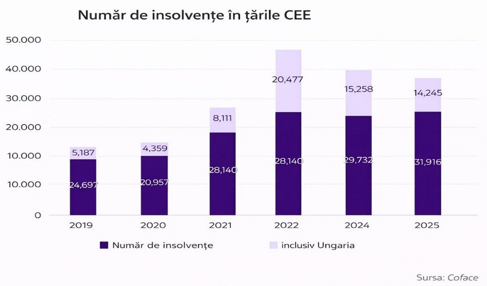 Polonia a înregistrat cea mai puternică creștere, insolvențele crescând cu +17,8%, reflectând în mare măsură utilizarea tot mai extinsă a procedurilor de restructurare, mai degrabă decât o deteriorare bruscă a activității comerciale. Slovenia (+12,9%), Serbia (+9,6%), Republica Cehă (+8,7%) și România (+3,8%) au înregistrat, de asemenea, niveluri ridicate ale numărului de insolvențe, determinate de o combinație de înăsprire fiscală, incertitudine politică, cerere externă slabă și deteriorarea comportamentului de plată.