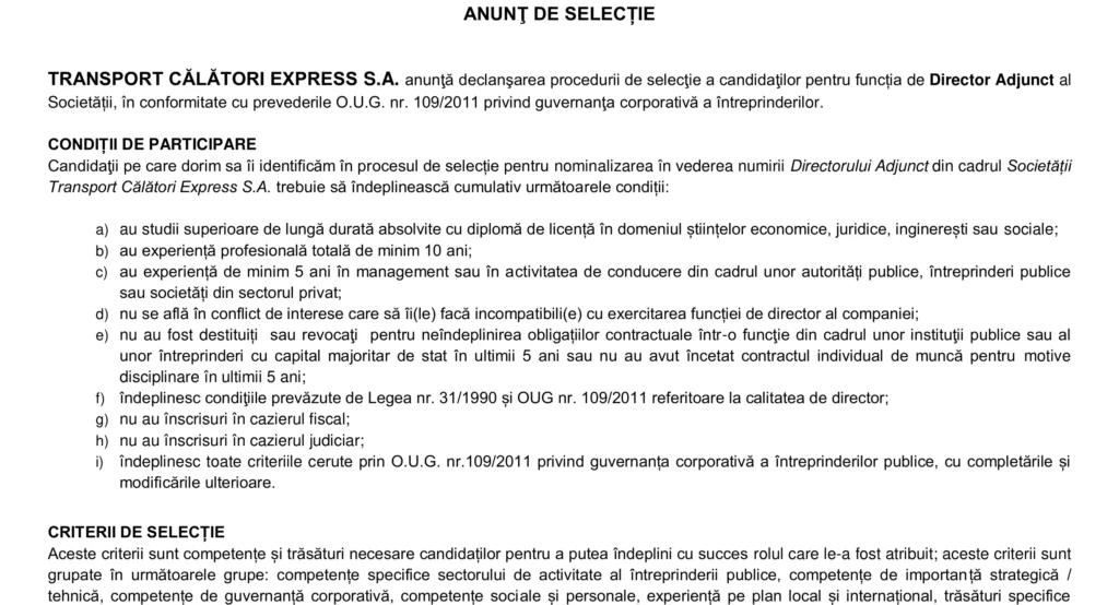 Anunțuri INSTRUCȚIUNI ȘI INFORMAȚII SUPLIMENTARE ÎN VEDEREA SELECȚIEI PENTRU POZIŢIA DE DIRECTOR ADJUNCT AL TRANSPORT CĂLĂTORI EXPRESS S.A. Autor Curierul Național Publicat 6 februarie 2026 Distribuie Distribuie articolul Facebook Whatsapp Whatsapp LinkedIn Reddit Telegram Email Copy Link Print Articolul anterior INSTRUCȚIUNI ȘI INFORMAȚII SUPLIMENTARE ÎN VEDEREA SELECȚIEI PENTRU POZIŢIA DE DIRECTOR FINANCIAR AL TRANSPORT CĂLĂTORI EXPRESS S.A. Articolul următor INSTRUCȚIUNI ȘI INFORMAȚII SUPLIMENTARE ÎN VEDEREA SELECȚIEI PENTRU POZIŢIA DE DIRECTOR GENERAL AL TRANSPORT CĂLĂTORI EXPRESS S.A. Niciun comentariu Lasă un răspuns Anulează răspunsulAdresa ta de email nu va fi publicată. Câmpurile obligatorii sunt marcate cu *Comentariu * Nume * Email * Site web -Publicitate- Ultimele articole Cum se depune Declarația Unică privind impozitul pe venit (212) și contribuțiile sociale datorate de persoanele fizice Fiscalitate Formule de lapte praf pentru sugari, retrase de pe piață Actualitate Mecanismul de Ajustare la Frontieră a Emisiilor de Carbon (CBAM) – un factor major de cost pentru importul structurilor eoliene din oțel – punct de vedere Energie Știri FinanciareTrei companii de stat sunt în top 5 după numărul de angajați. Cum stau la productivitateUnul din cinci cetățeni din orașele din Europa Centrală și de Est nu are mașinăAndrea Allocco a fost ales noul Președinte Confindustria RomâniaPiața de spații logistice și industriale a atins un nivel record în 2025