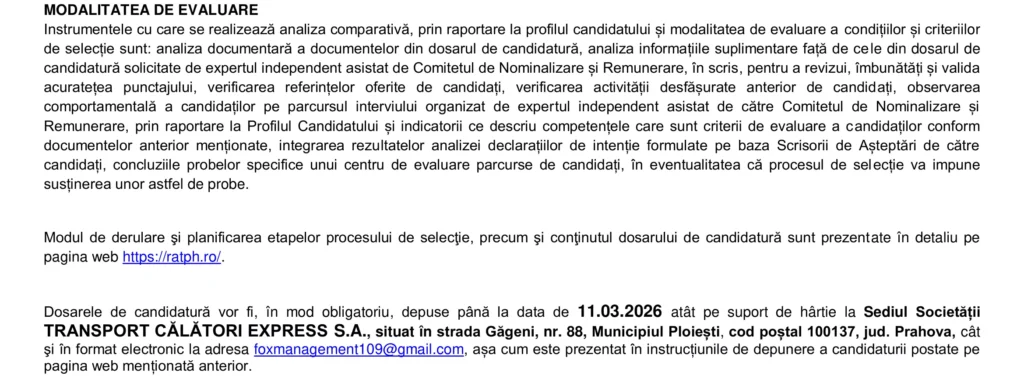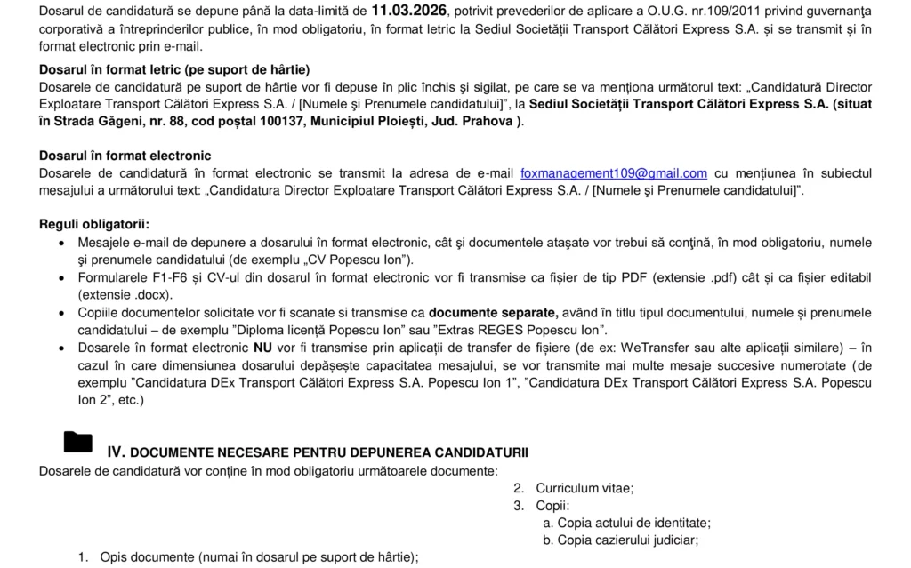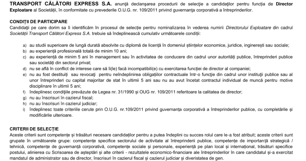 Reading: INSTRUCȚIUNI ȘI INFORMAȚII SUPLIMENTARE ÎN VEDEREA SELECȚIEI PENTRU POZIŢIA DE DIRECTOR EXPLOATARE AL TRANSPORT CĂLĂTORI EXPRESS S.A.