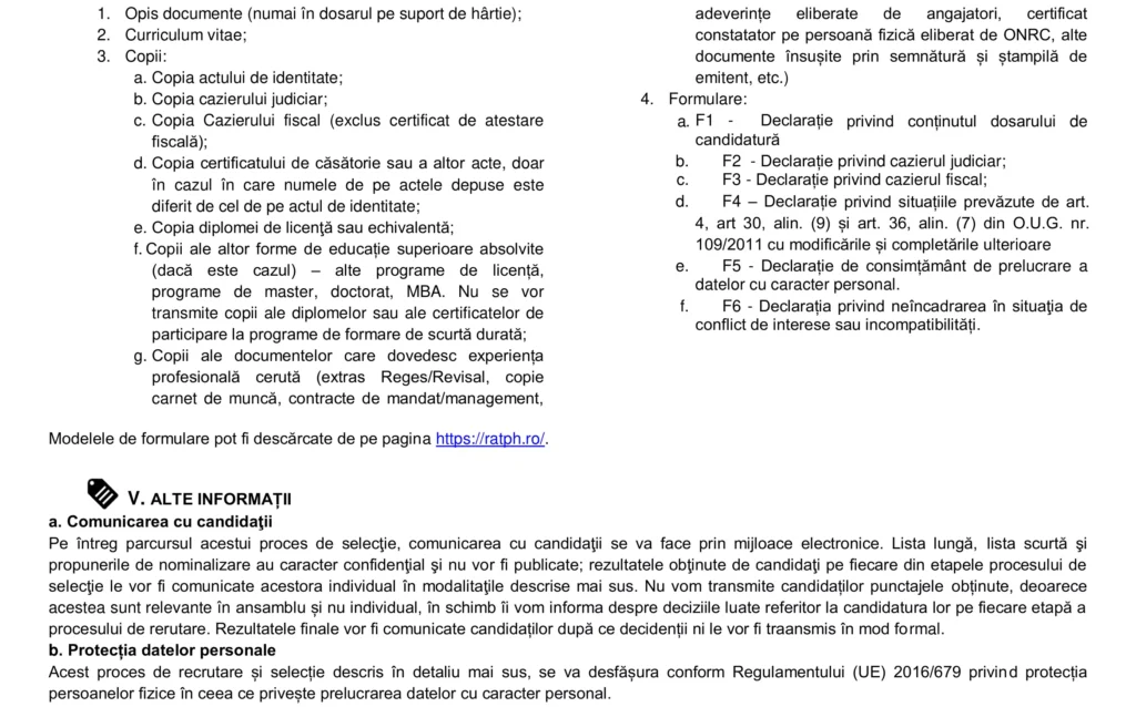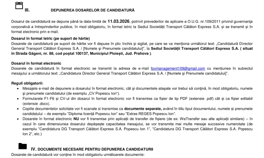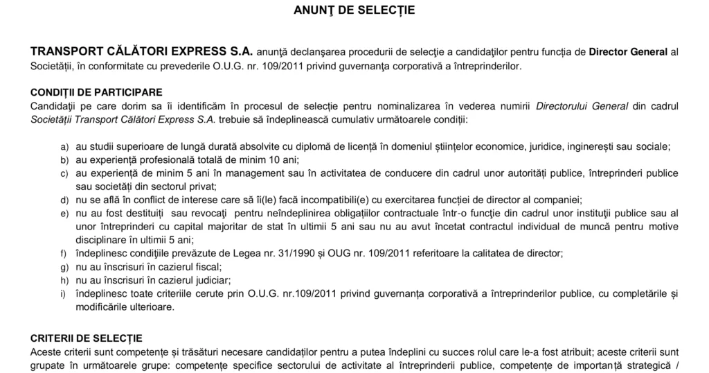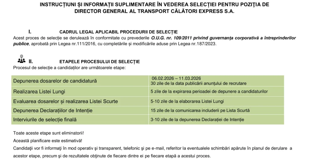 Anunțuri INSTRUCȚIUNI ȘI INFORMAȚII SUPLIMENTARE ÎN VEDEREA SELECȚIEI PENTRU POZIŢIA DE DIRECTOR GENERAL AL TRANSPORT CĂLĂTORI EXPRESS S.A. Autor Fox Management Consultants Publicat 6 februarie 2026 Distribuie Distribuie articolul Facebook Whatsapp Whatsapp LinkedIn Reddit Telegram Email Copy Link Print Articolul anterior INSTRUCȚIUNI ȘI INFORMAȚII SUPLIMENTARE ÎN VEDEREA SELECȚIEI PENTRU POZIŢIA DE DIRECTOR ADJUNCT AL TRANSPORT CĂLĂTORI EXPRESS S.A. Articolul următor Cristi Chivu a purtat torţa olimpică pentru Jocurile Olimpice Milano-Cortina 2026 Niciun comentariu Lasă un răspuns Anulează răspunsulAdresa ta de email nu va fi publicată. Câmpurile obligatorii sunt marcate cu *Comentariu * Nume * Email * Site web -Publicitate- Ultimele articole Cum se depune Declarația Unică privind impozitul pe venit (212) și contribuțiile sociale datorate de persoanele fizice Fiscalitate Formule de lapte praf pentru sugari, retrase de pe piață Actualitate Mecanismul de Ajustare la Frontieră a Emisiilor de Carbon (CBAM) – un factor major de cost pentru importul structurilor eoliene din oțel – punct de vedere Energie Știri FinanciareTrei companii de stat sunt în top 5 după numărul de angajați. Cum stau la productivitateUnul din cinci cetățeni din orașele din Europa Centrală și de Est nu are mașinăAndrea Allocco a fost ales noul Președinte Confindustria RomâniaPiața de spații logistice și industriale a atins un nivel record în 2025