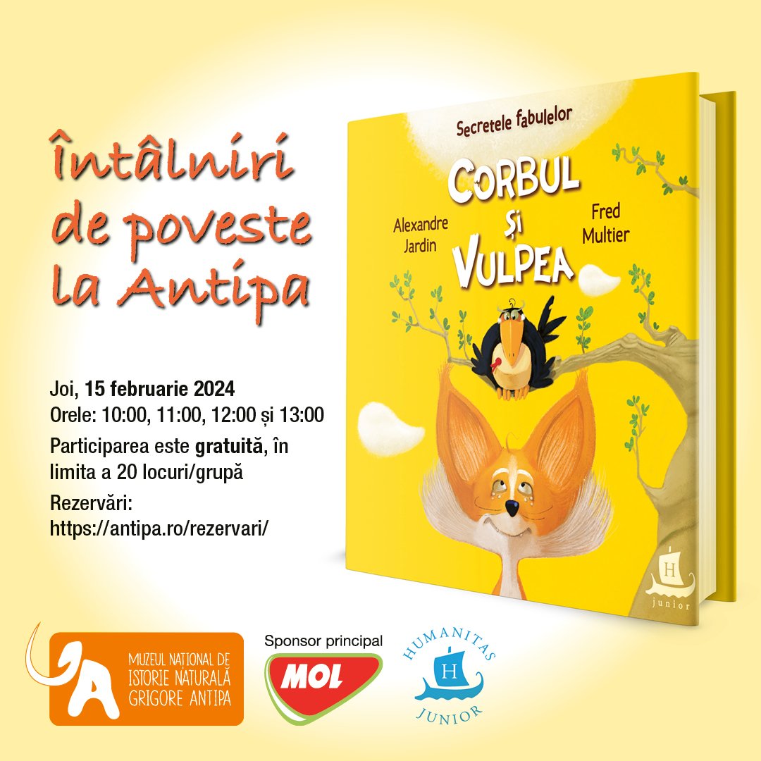 Cele 4 întâlniri vor avea loc joi, 15 februarie, de la orele 10:00, 11:00, 12:00 și 13:00 în Atriumul Muzeului. Vom citi una dintre cele mai frumoase fabule ale lui La Fontaine, „Secretele Fabulelor. Corbul și vulpea“, reinterpretate de Alexandre Jardin, cu ilustrații de Fred Multier. Vom descoperi activitățile distractive din paginile lecturate și apoi vom porni într-o mică expediție în muzeu în căutarea personajelor din poveste.