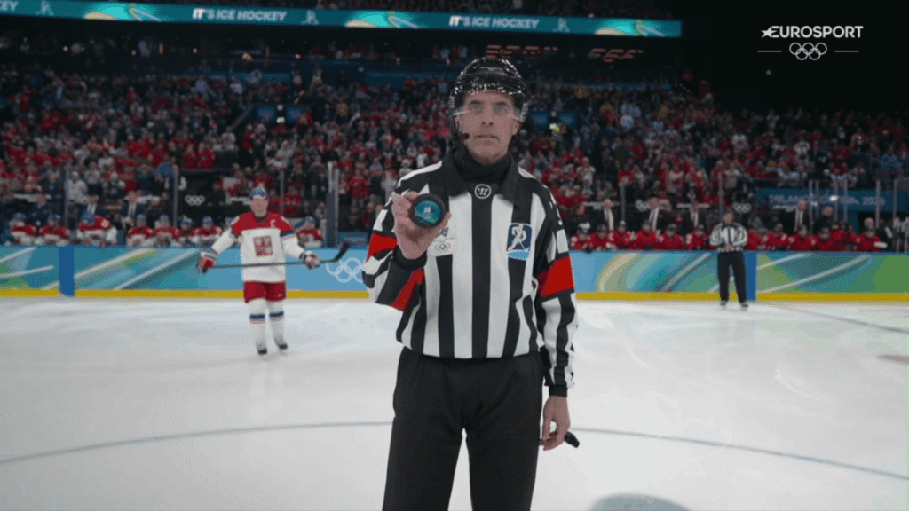 La startul meciului Canada-Cehia, arbitrul prezintă pucul oficial al competiției