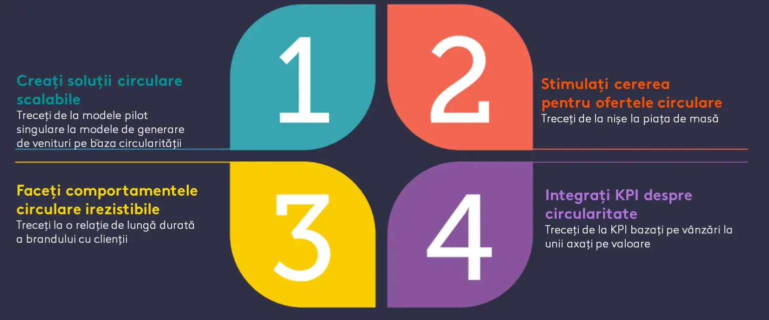 • Patru căi de acțiune: ghidul identifică patru căi critice pe care experții în marketing le pot urma pentru a valorifica oportunitățile economiei circulare. Aceste căi se concentrează pe crearea de relații pe termen lung cu clienții prin practici sustenabile, cum ar fi repararea produselor, revânzarea și încurajarea unei durate de viață mai lungi pentru produse.