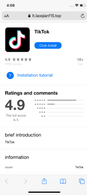 O pagină web care imita AppStore pentru a instala o falsă aplicație TikTok prin intermediul instrumentelor pentru dezvoltatori