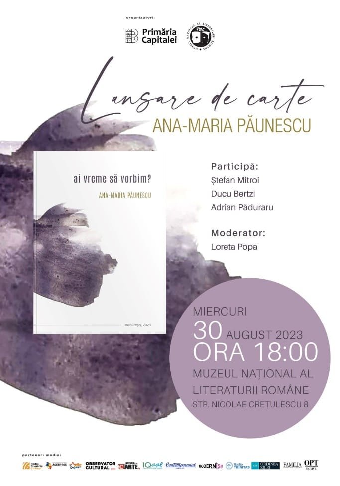 În București, lansarea celui de-al doilea volum de versuri intitulat: „ai vreme să vorbim?”, are loc la Muzeul Național al Literaturii Române, strada Nicolae Crețulescu nr. 8, în data de 30 august, 2023, la orele 18:00.