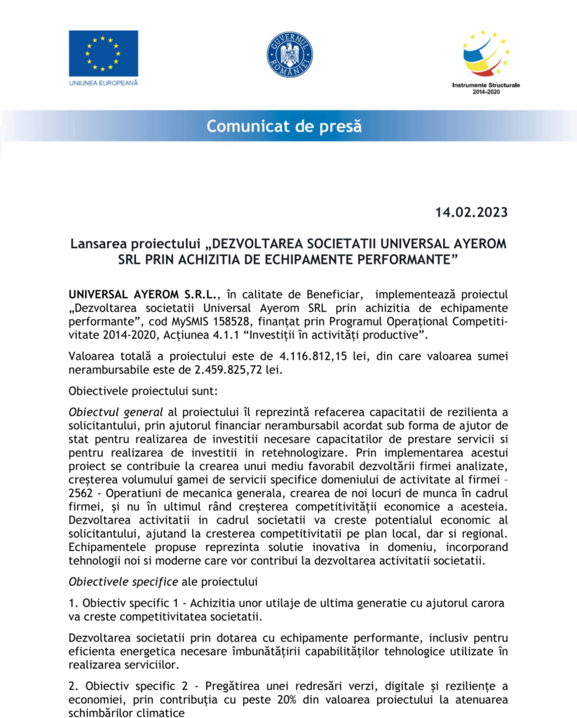 Fonduri Europene Lansarea proiectului „DEZVOLTAREA SOCIETATII UNIVERSAL AYEROM SRL PRIN ACHIZITIA DE ECHIPAMENTE PERFORMANTE” Autor Contributor Publicat 14 februarie 2023 Distribuie Distribuie articolul Facebook Whatsapp Whatsapp LinkedIn Reddit Telegram Email Copy Link Print Distribuie Articolul anterior Al. Florin Țene – scriitorul cu viziuni spirituale nobile Articolul următor Finalizare proiect „Dotarea unităților de învățământ din Comuna Drăgănești de Vede cu echipamente de protecție și dispozitive medicale” – COD SMIS 150028 Niciun comentariu Lasă un răspuns Anulează răspunsulAdresa ta de email nu va fi publicată. Câmpurile obligatorii sunt marcate cu *Comentariu * Nume * Email * Site web -Publicitate- Ultimele articole Avocații avertizează: închiderea pripită a firmelor poate genera riscuri juridice și pierderi mai mari decât criza Actualitate Featured Cum să reduci de 6 ori amprenta de carbon generată de producția publicitară? Actualitate CCR spune „DA” reformei pensiilor magistraților propusă de Guvernul Bolojan Politic Știri FinanciareInvestitorii români au generat 30% din volumul tranzacțiilor imobiliare de pe plan local în 2025Spitalul Infosan raportează afaceri de 20 milioane lei în anul 2025Peste 1.000 de pacienți români, tratați la spitalul privat Wiener Privatklinik din Viena în 2025Diconium a depășit pragul de 100 angajați la trei ani de la lansarea operațiunilor locale