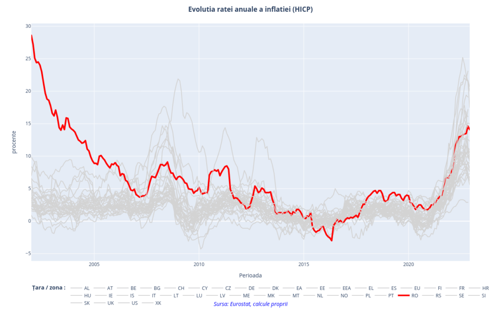 Revenind la graficul nostru, vedem în perioada de final a anului trecut o posibilă tendință de inversare a trendului inflației, ceea ce ar echivala cu o reducere a ritmului de creștere a prețurilor. Această tendință potențială este vizibilă la nivel european și este susținută de recentele reduceri de prețuri observate pe piețele de tranzacționare a combustibililor, energiei, altor materii prime importante pentru industrie, de reducerea cererii ca efect al înăspririi condițiilor monetare și scăderii puterii de cumpărare, de moderarea anticipațiilor etc. România se plasează în continuare în interiorul acestui pluton, nu este nici la cel mai ridicat nivel după cum nu este nici la cel mai scăzut. Recenta reducere a ratei inflației în România din luna decembrie sugerează că nici de această dată dinamica prețurilor pe plan local nu va face abstracție de la trendurile generale manifestate pe plan european.