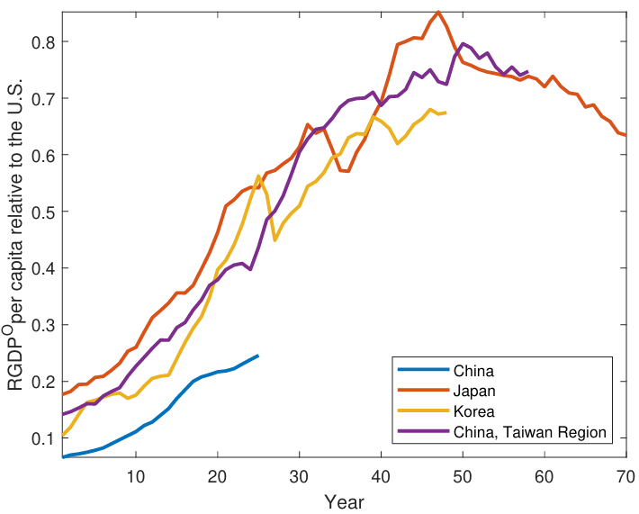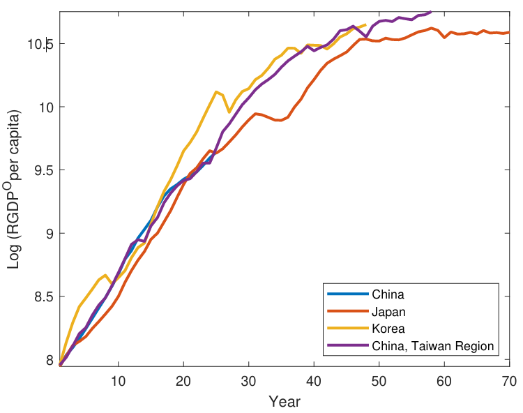 Graficul de mai sus ilustrează evoluția PIB-ului real pe locuitor (asupra căruia a fost aplicat operatorul de logaritmare) în cazul Chinei, Japoniei, Coreei de Sud și Taiwanului. Datele arată clar că traiectoria urmată de China este foarte asemănătoare cu cea a celorlalte trei economii est-asiatice, considerate exemple de succes. Din grafic se poate observa faptul că la aproximativ 25 de ani după ce au atins statutul de economii cu venituri medii, China, Japonia și Taiwan au ajuns la niveluri similare ale PIB-ului real pe locuitor. Singura excepție este Coreea de Sud, care a înregistrat progrese ceva mai rapide. Aceste observații sugerează că ritmul de creștere al PIB-ului real al Chinei nu diferă în mod semnificativ de cel al acestor economii.