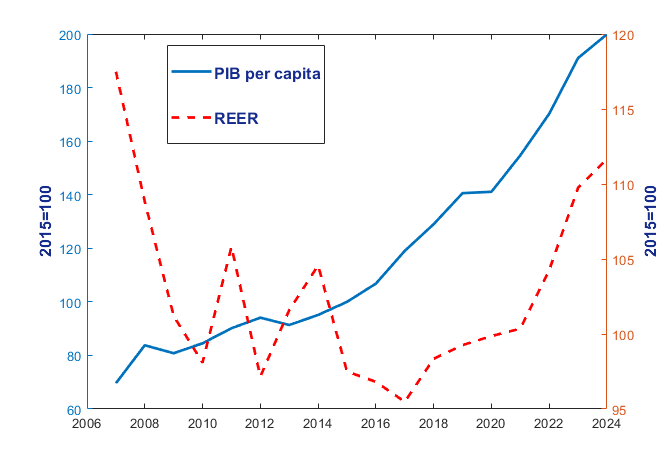 În graficul de mai sus regăsim evoluția (date cu frecvență anuală) PIB pe locuitor la paritatea puterii de cumpărare și a cursului real de schimb aproximat prin măsura REER (scala din stânga) în cazul țării noastre. Ambele variabile sunt exprimate ca și indici cu baza fixă în 2015. Se poate observa cum ambii indici manifestă tendințe similare începând cu anul 2017, însă viteza de creștere a indicelui PIB pe locuitor o depășește clar pe cea a indicelui REER.