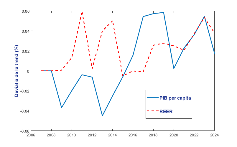 Figura 4: Evoluții ciclice pentru PIB pe locuitor și cursul real de schimb în România