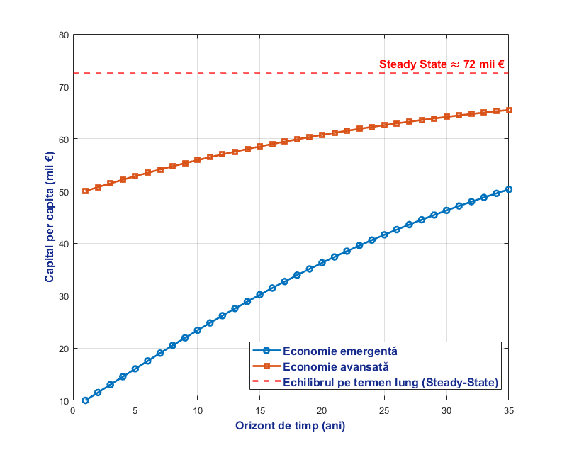 Pentru a reda cât mai bine procesul de convergență am recurs la parametrizarea modelului Solow pentru cazul unei economii avansate, respectiv al unei economii emergente aflate într-un proces de convergență. În cadrul acestui exercițiu contrafactual cantitativ am considerat o calibrare relativ standard, unde rata de depreciere a capitalului este de 5% pe an, rata de economisire este de 20%, în timp ce ponderea capitalului în venitul total din economie este 30%. În cadrul exercițiului, cele două tipuri de economii se deosebesc prin nivelul inițial al capitalului pe locuitor. Astfel, pentru economia emergentă am considerat un nivel al capitalului pe locuitor de 5 mii de euro, în timp ce pentru economia avansată, nivelul capitalului pe locuitor a fost calibrat la 10 mii de euro. Întrucât rata de depreciere a capitalului, rata de economisire, respectiv ponderea capitalului în venitul total din economie sunt aceleași pentru ambele tipuri de economii, rezultă un nivel de echilibru pe termen lung al capitalului pe locuitor de 72 mii de euro. Pentru analiza de față am considerat un orizont de timp de 35 de ani.