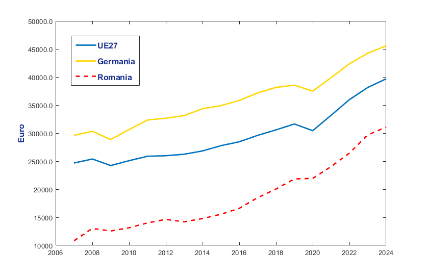 Pentru a ilustra evoluția convergenței în cadrul UE, am prezentat mai jos evoluția PIB pe locuitor la paritatea puterii de cumpărare, atât ca medie la nivelul Uniunii, cât și pentru Germania (ca proxy pentru zona euro) și pentru România.